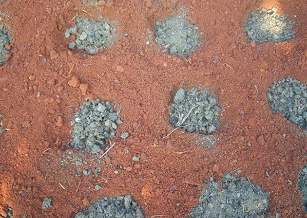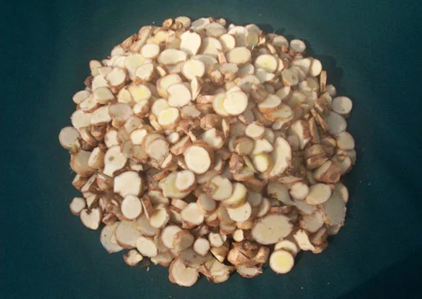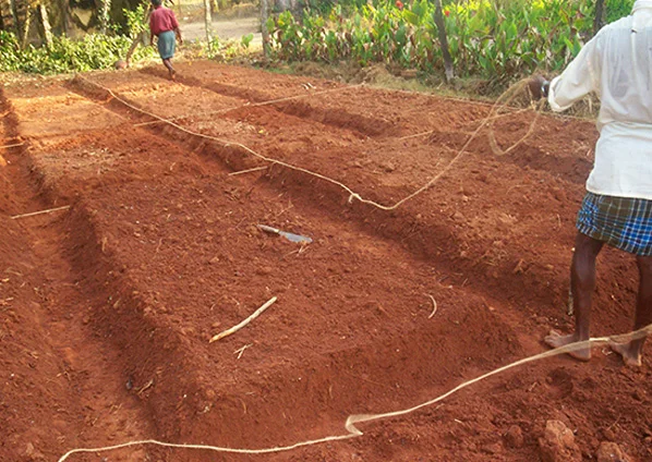 Prepare beds of 3 m length, 1 m width, 25 cm height and 40 cm spacing between beds during April-May with the commencement of pre-monsoon showers. Take small pits of the size of split coconut shell in the beds with a spacing of 25 x 25 cm and fill the pits with 1/2 kg dried and powdered cow dung. Instead of cow dung, compost, vermicompost or any other organic manure will be sufficient. Instead of applying organic manure to individual pits, broadcasting 25 kg organic manure per bed and incorporating well into the soil can also be adopted. Rhizome bits weighing about 15 g with at least one viable bud is planted at a depth of 5 cm. A seed rate of approximately 1500 kg per ha is required.